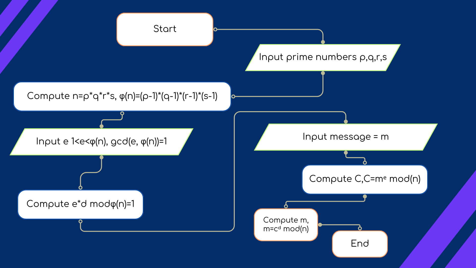 ◉ The private exponent 'd' is computed such that (e * d) ≡ 1 (mod φ(N)).